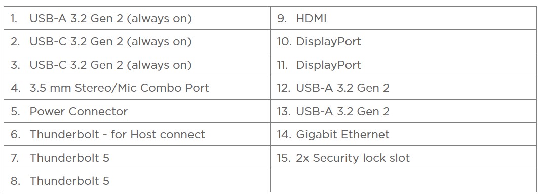 Front: 1 x USB-A 3.2 Gen 2 (10Gbps data, AOU 12W) 2 x USB-C data port (10Gbps data, AOU 15W) Back: 2 x USB-A 3.2 Gen 2 (10Gbps data, 10W) 2 x TBT 5, Full Function(15W)