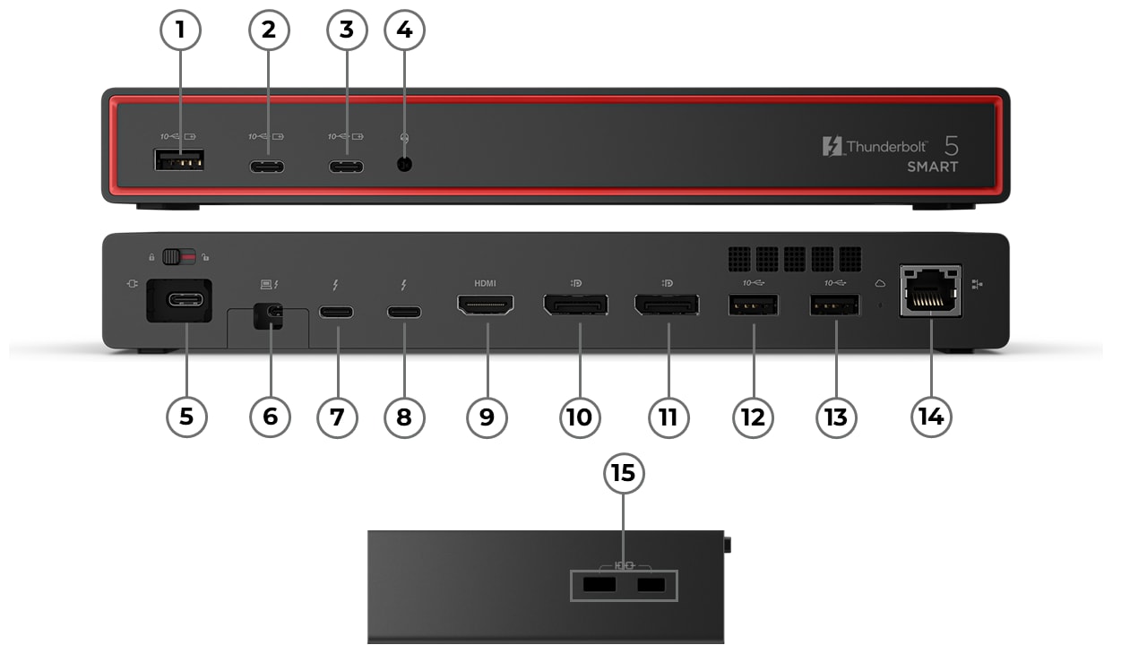 Verpackungsinhalt ThinkPad Thunderbolt 5 Smart Dock 265 W Netzteil Netzkabel Standard-Thunderbolt-Kabel Garantieunterlagen